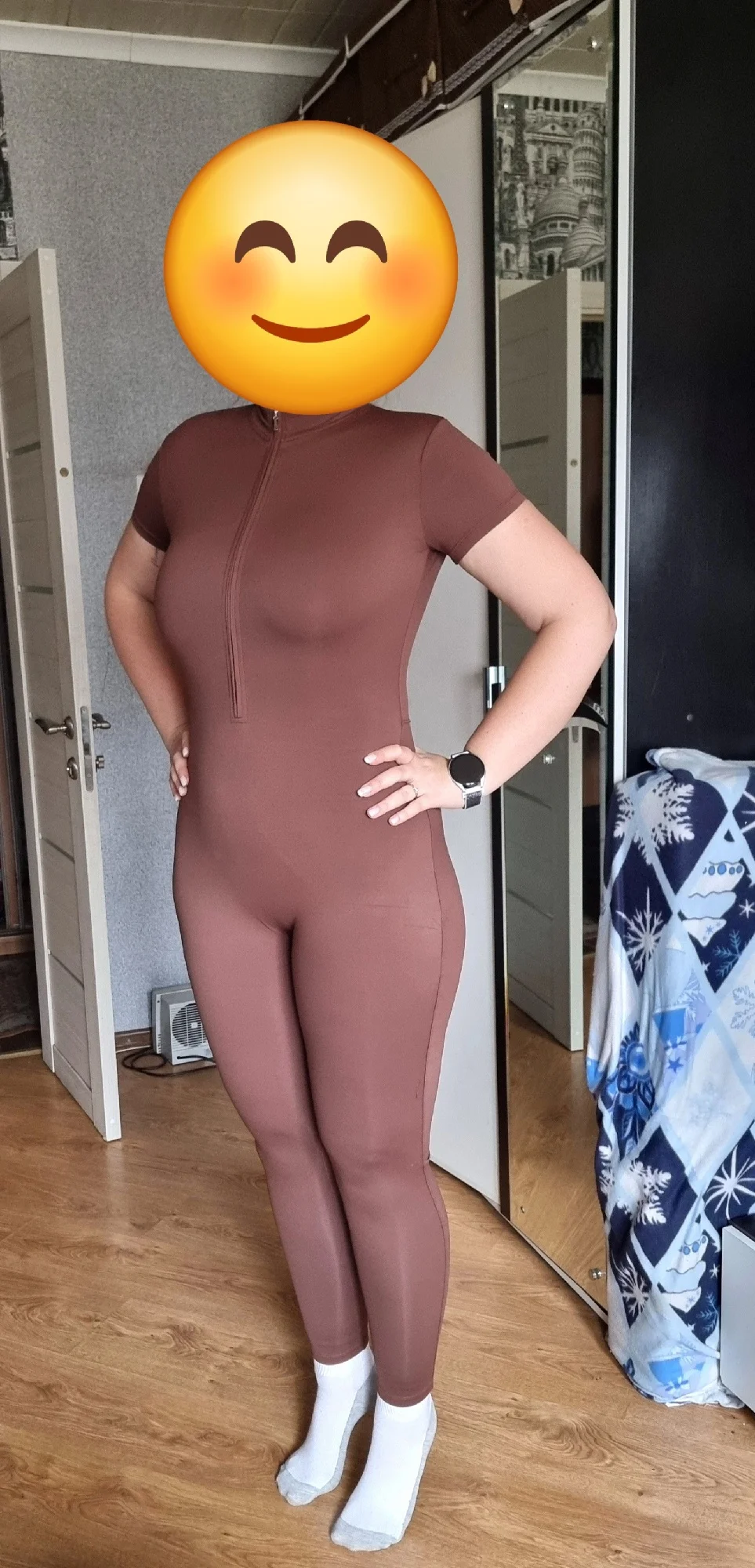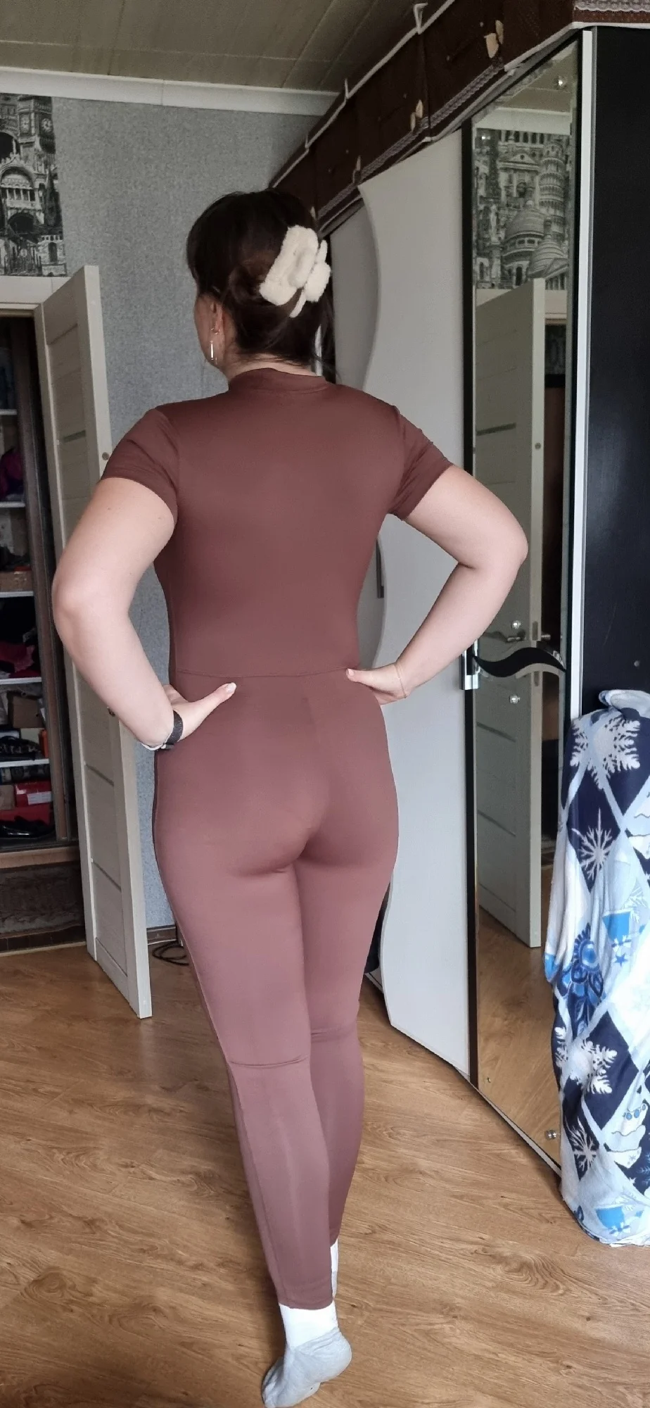 amazing! beautiful color, good style! I was afraid that when I sweat in the gym, it would all be visible, but it's practically invisible! very comfortable, unlike the overalls with shorts, that one constantly rides up, but in this one I feel maximally comfortable. arrived with stains, but they washed off)